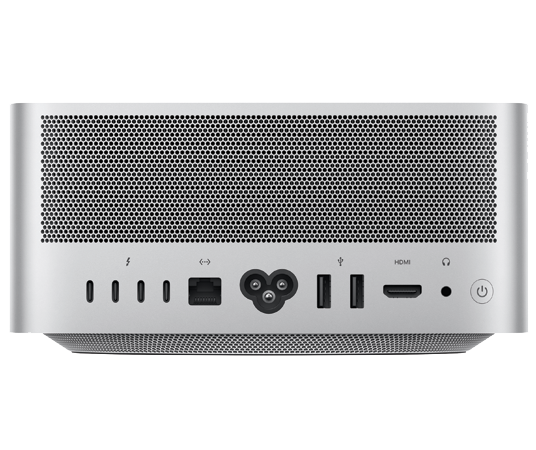 | Input Device | External I/O Ports 4 x Thunderbolt 5 (up to 120 Gbps) USB 4 (up to 120 Gbps) USB 3 (up to 10 Gbps) DisplayPort 2.1 Two USB 3 (USB‑A) ports (up to 5 Gbps) HDMI 2.1 port 10Gb Ethernet 3.5mm headphone jack On front (M4 Max): Two USB Type‑C ports (up to 10 Gbps) SDXC card slot (UHS-II) |